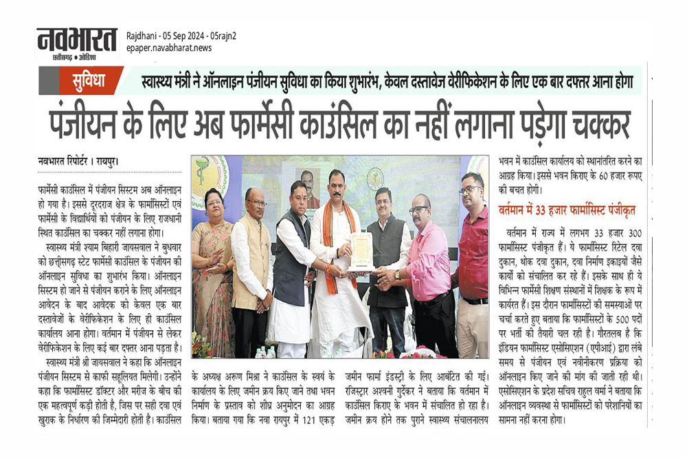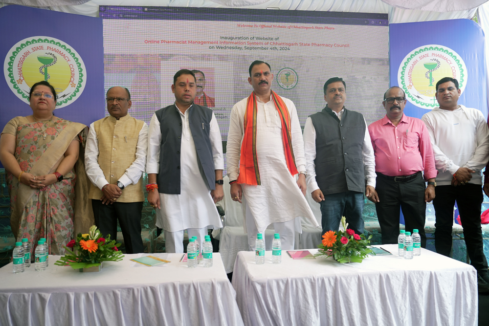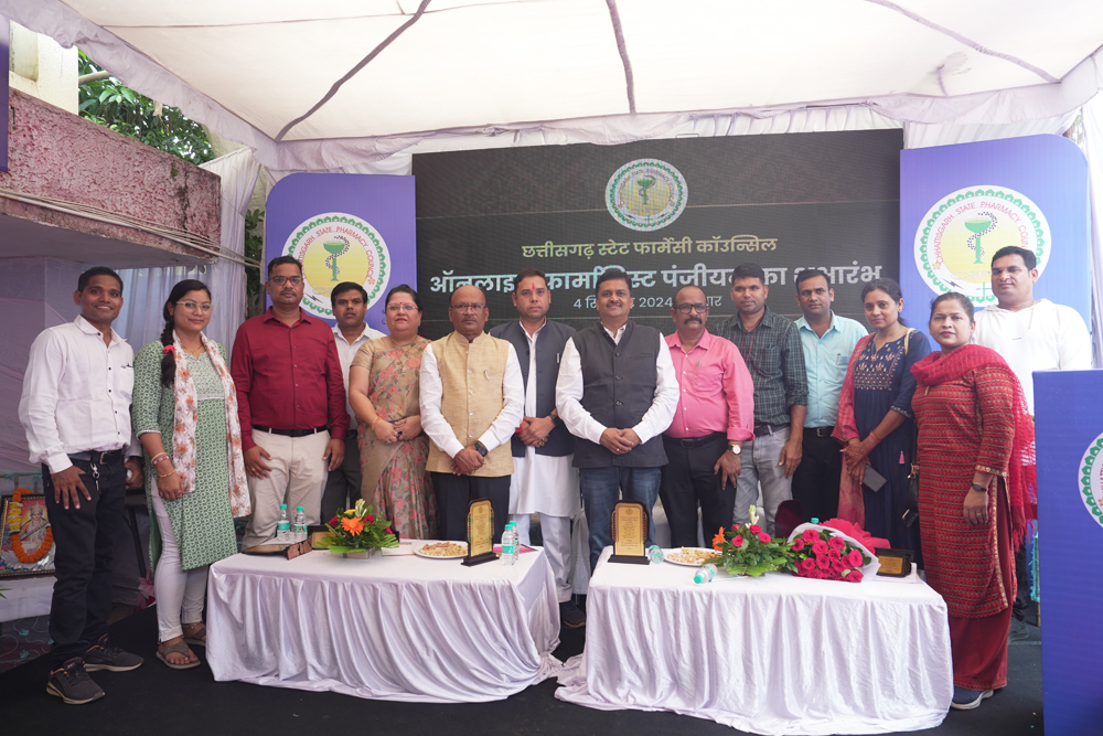 छत्तीसगढ़ स्टेट फार्मेसी कॉउन्सिल में फार्मासिस्टों के ऑनलाइन पंजीयन सुविधा का शुभारंभ माननीय श्री श्याम बिहारी जायसवाल जी, मन्त्री छ.ग. शासन लोक स्वास्थ्य एवं परिवार कल्याण तथा चिकित्सा शिक्षा विभाग के करकमलों से बुधवार, 04 सितम्बर, 2024 को छत्तीसगढ़ स्टेट फार्मेसी कॉउन्सिल के कार्यालय परिसर आनन्द नगर, रायपुर में किया गया। इस अवसर पर छत्तीसगढ़ स्टेट फार्मेसी कॉउन्सिल के अध्यक्ष श्री अरूण कुमार मिश्रा, उपाध्यक्ष श्री राहुल तिवारी, रजिस्ट्रार श्री अश्वनी गुर्देकर, कार्यकारिणी सदस्य श्री विजय पारख, श्री निकेश देवॉंगन, डॉ0 चंचलदीप कौर, फार्मेसी काउन्सिल ऑफ इण्डिया प्रतिनिधि डॉ0 आनन्द महलवार, काउन्सिल के सदस्य श्री परमानन्द पटेल, काउन्सिल कार्यालय के कर्मचारियों, विभिन्न मिडिया प्रतिनिधियों सहित विभिन्न फार्मेसी कॉलेजोें के छात्र-छात्राये उपस्थित थे |
